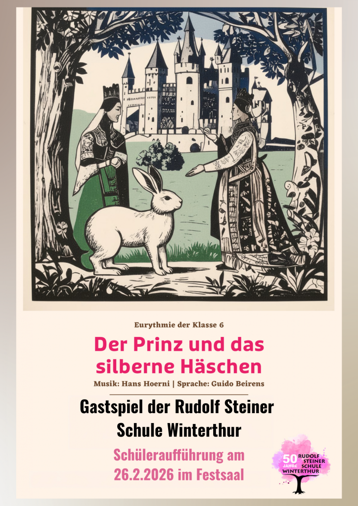 Am 26.2.2026 ist die 6. Klasse der Rudolf Steiner Schule Winterthur/Schweiz zu Gast und zeigt das Märchen „Der Prinz und das silberne Häschen“ in einer Schüleraufführung. Wir freuen uns sehr über dieses Gastspiel und die Gelegenheit, den Austausch zwischen unseren Schulen weiter zu vertiefen.